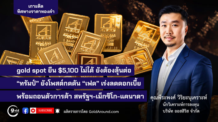 gold spot ยืน $5,100 ไม่ได้ ยังต้องลุ้นต่อ “ทรัมป์” ยังโพสต์กดดัน “เฟด” เร่งลดดอกเบี้ย พร้อมถอนตัวการค้า สหรัฐ-เม็กซิโก-แคนาดา