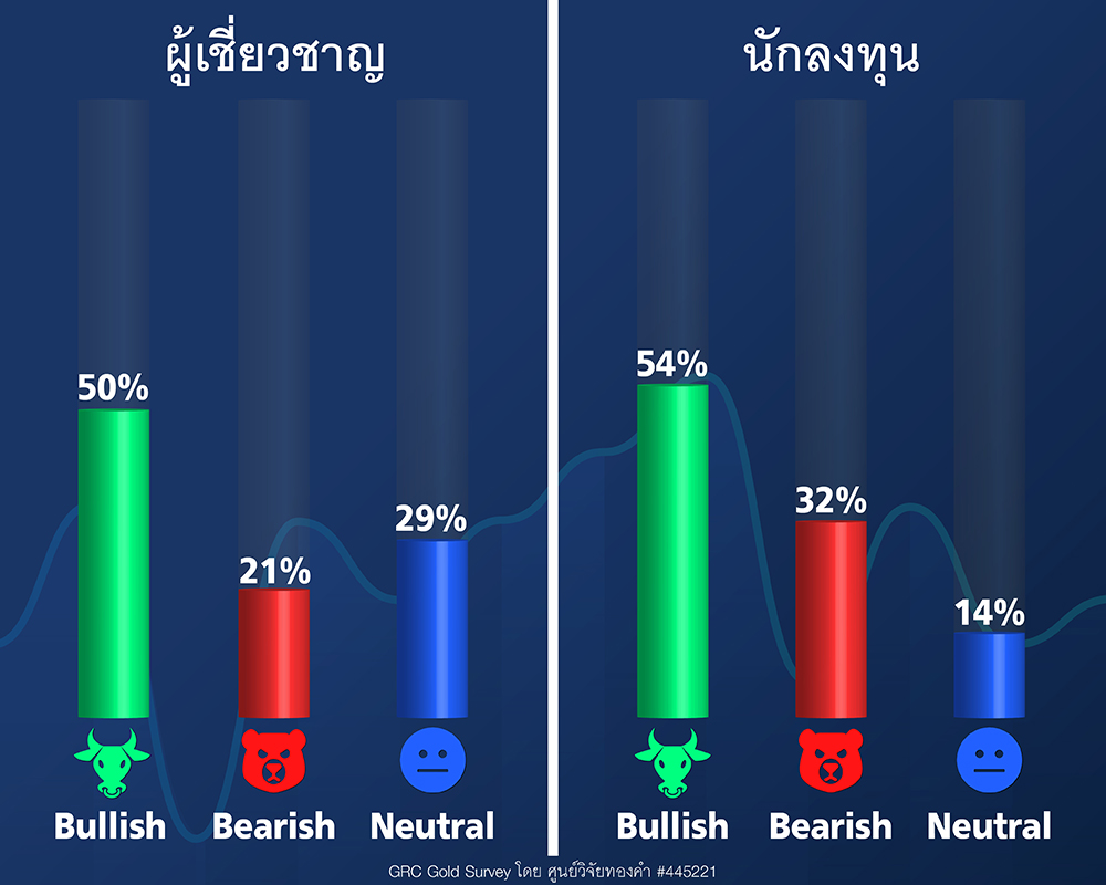 14 ผู้เชี่ยวชาญในตลาดทองคำที่ได้มีส่วนร่วมตอบแบบสำรวจ ในจำนวนนี้มี 7 ราย หรือเทียบเป็น 50% คาดว่าราคาทองคำในสัปดาห์หน้าจะปรับเพิ่มขึ้น ส่วนจำนวน 3 ราย หรือเทียบเป็น 21% คาดว่าราคาทองคำจะลดลง และ จำนวน 4 ราย หรือเทียบเป็น 29% คาดว่าราคาทองคำจะใกล้เคียงกับสัปดาห์ที่ผ่านมา