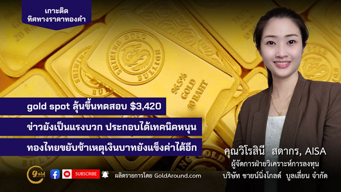 gold spot ลุ้นขึ้นทดสอบ $3,420 ข่าวยังเป็นแรงบวกประกอบได้เทคนิคหนุน ทองไทยขยับช้าเหตุเงินบาทยังแข็งค่าได้อีก