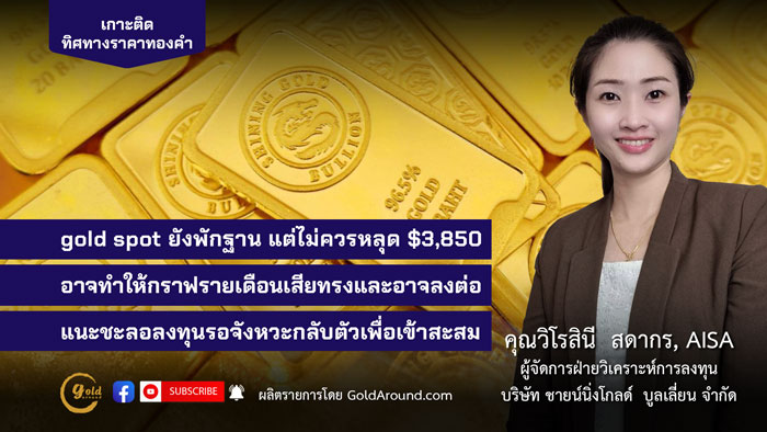 เพราะหากราคาหลุด 3,850 ดอลลาร์ จะส่งผลให้กราฟรายเดือนดูไม่ดี และเป็นสัญญาณอันตรายอาจนำไปสู่การพักฐานที่ลึกและยาวนาน นักลงทุนควรลุ้นให้ราคาสามารถยืนเหนือ 3,850 ดอลลาร์ให้ได้จนถึงสิ้นเดือนนี้ (วันศุกร์) เพื่อหลีกเลี่ยงการปิดแท่งเทียนรายเดือนเป็นสีแดง ซึ่งจะส่งสัญญาณเชิงลบอย่างรุนแรงต่อไตรมาสถัดไป