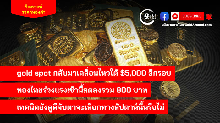 gold spot กลับมาเคลื่อนไหวใต้ $5,000 อีกรอบ ทองไทยร่วงแรงเช้านี้ลดลงรวม 800 บาท เทคนิคยังดูดีจับตาจะเลือกทางสัปดาห์นี้หรือไม่
