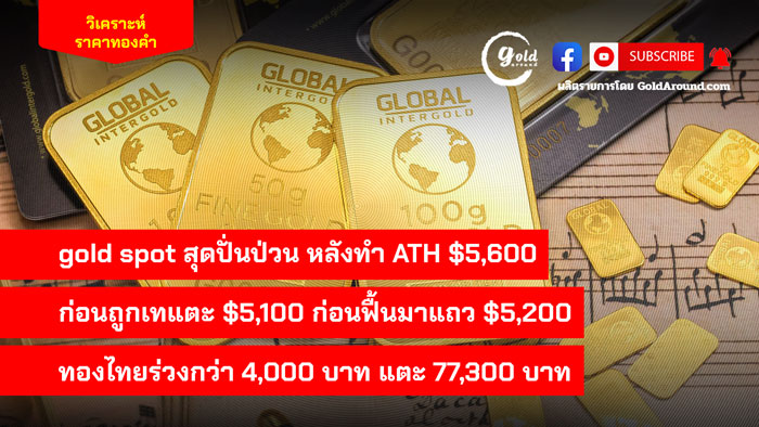 gold spot สุดปั่นป่วน หลังทำ ATH $5,600 ก่อนถูกเทแตะ $5,100 แต่ยังเหนียวฟื้นมาแถว $5,200 ด้านทองคำไทยร่วงกว่า 4,000 บาท แตะ 77,300 บาท