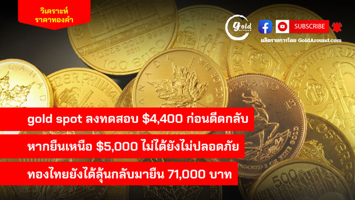 gold spot ลงทดสอบ $4,400 ก่อนดีดกลับ หากยืนเหนือ $5,000 ไม่ได้ยังไม่ปลอดภัย ทองไทยยังได้ลุ้นกลับมายืน 71,000 บาท