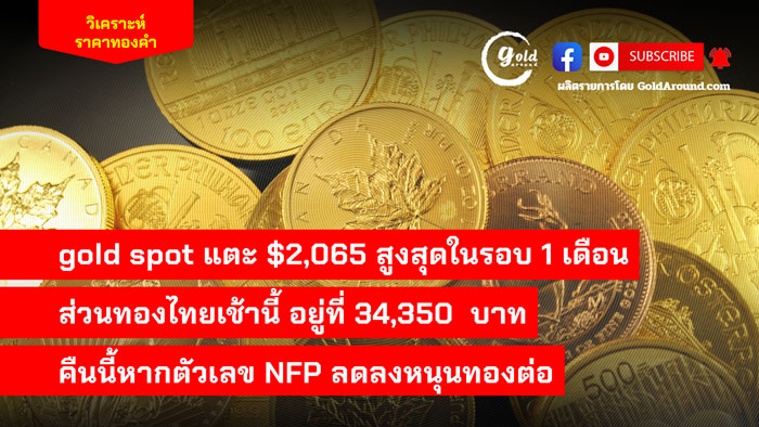 ราคาทองคำ gold spot แตะ $2,065 สูงสุดในรอบ 1 เดือน ส่วนทองไทยเช้านี้ อยู่ที่ 34,350 บาท คืนนี้หากตัวเลข NFP ลดลง หนุนทองคำต่อ