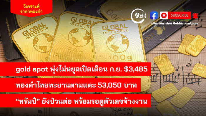 gold spot พุ่งไม่หยุดเปิดเดือนก.ย. $3,485 ทองคำไทย ทะยานตามแตะ 53,050 บาท “ทรัมป์” ยังป่วนต่อพร้อมรอดูตัวเลขจ้างงาน