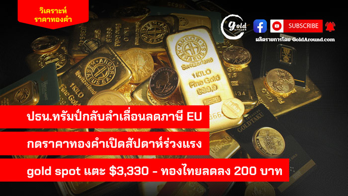 ปธน.ทรัมป์กลับลำเลื่อนลดภาษี EU กดราคาทองคำเปิดสัปดาห์ร่วงแรง gold spot แตะ $3,330 -ทองไทยลดลง 200 บาท