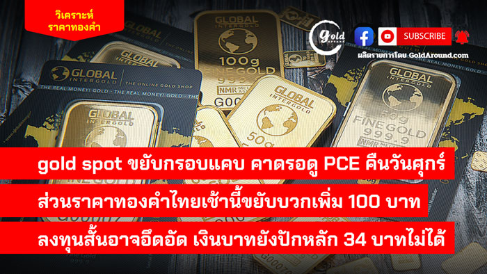 gold spot ขยับกรอบแคบคาดรอดู PCE คืนวันศุกร์ ส่วนราคาทองคำไทยเช้านี้บวกเพิ่ม 100 บาท ลงทุนสั้นอาจอึดอัดเงินบาทยังยืนเหนือ 34 บาทไม่ได้