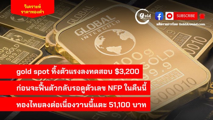 gold spot ทิ้งตัวแรงลงทดสอบ $3,200 ก่อนจะฟื้นตัวกลับ รอดูตัวเลข NFP ในคืนนี้ ด้านทองคำไทยลงต่อเนื่องวานนี้ แตะ 51,100 บาท