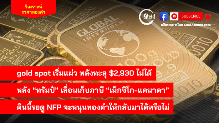 goldspot เริ่มแผ่วหลังทะลุ $2,930 ไม่ได้ หลัง “ทรัมป์” เลื่อนเก็บภาษี “เม็กซิโก-แคนาดา” คืนนี้รอดู NFP จะหนุนทองคำให้กลับมาได้หรือไม่