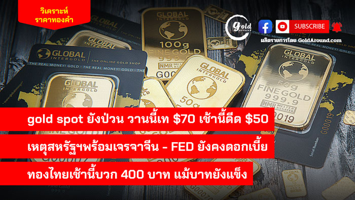 gold spot ยังป่วนวานนี้เท $70 เช้านี้ดีด $50 เหตุสหรัฐพร้อมเจรจาจีน- FED ยังคงดบ. ทองไทยเช้านี้บวก 400 บาทแม้บาทยังแข็ง