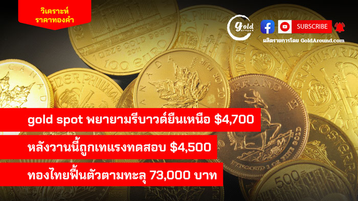 gold spot พยายามรีบาวด์ยืนเหนือ $4,700 หลังวานนี้ถูกเทแรงทดสอบ $4,500 ทองไทยฟื้นตัวตามทะลุ 73,000 บาท