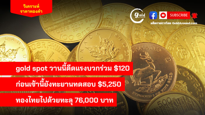 gold spot วานนี้ดีดแรงบวกร่วม $120 ก่อนเช้านี้ยังทะยานทดสอบ $5,250 ทองไทยไปด้วยทะลุ 76,000 บาท