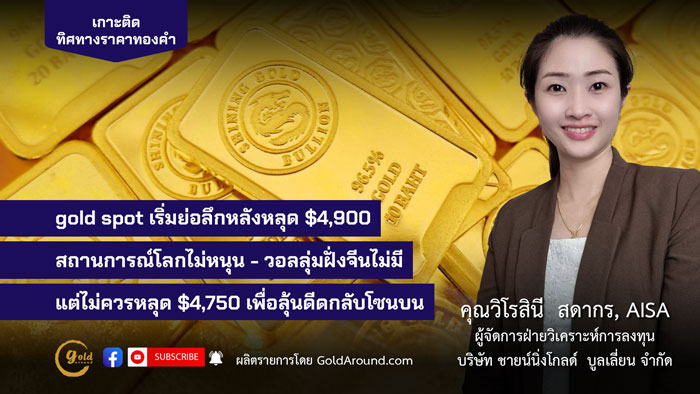gold spot เริ่มย่อลึกหลังหลุด $4,900 สถานการณ์โลกไม่หนุน-วอลลุ่มฝั่งจีนไม่มี แต่ไม่ควรหลุด $4,750 เพื่อลุ้นดีดกลับโซนบน